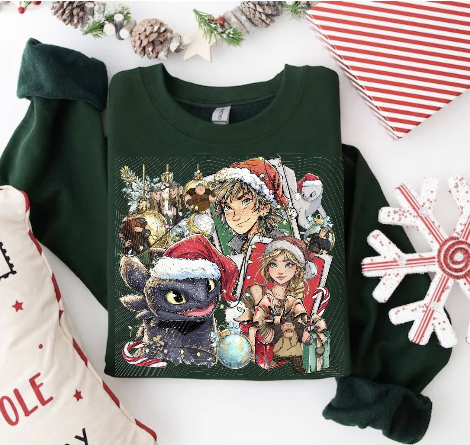 Magical Christmas sweatshirt featuring a fantasy dragon and winter-themed characters. Ideal for fantasy lovers, holiday wear, and cozy seasonal fashion.