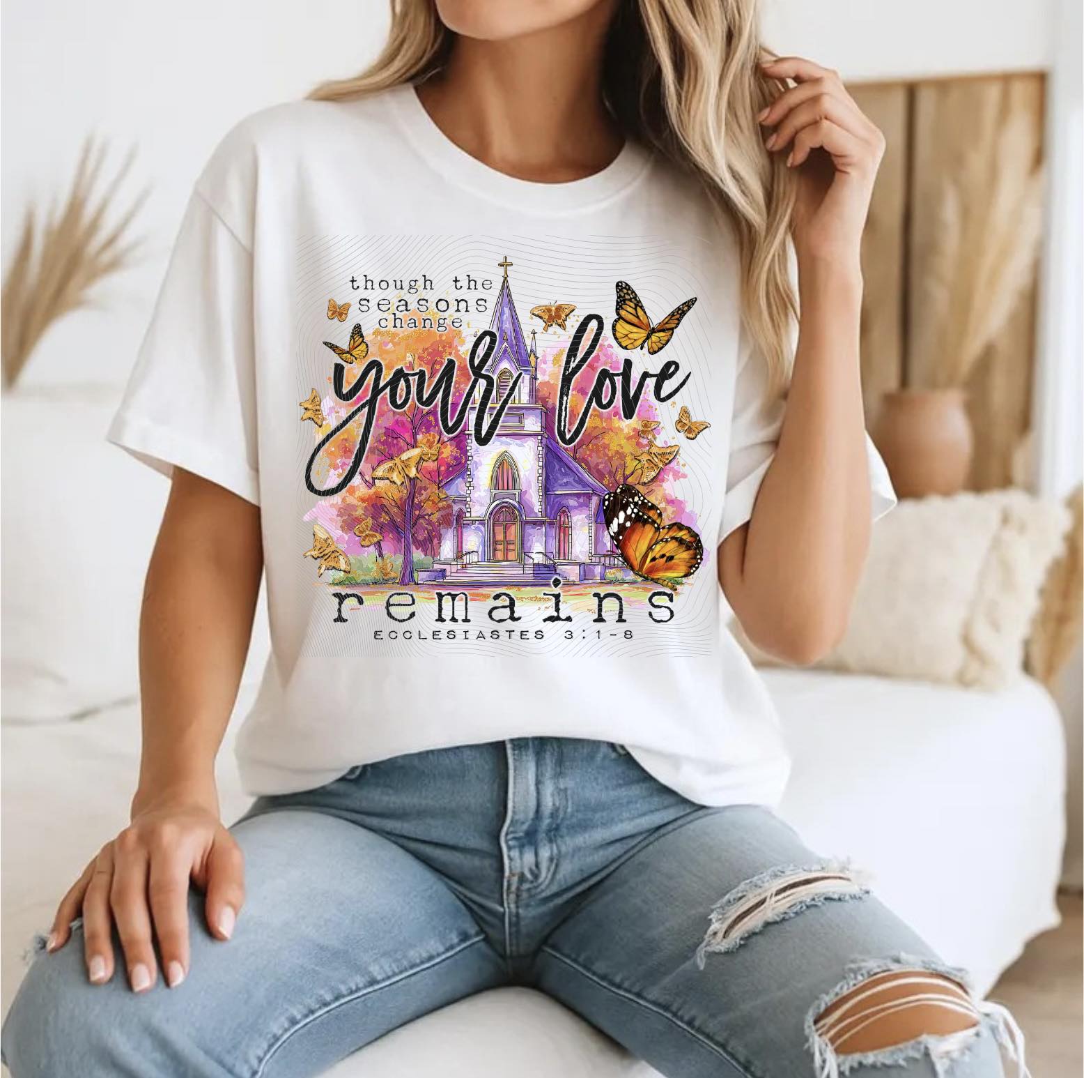 Artistic t-shirt featuring a colorful illustration and inspirational message about enduring love. Designed for those who appreciate expressive visuals and meaningful apparel.