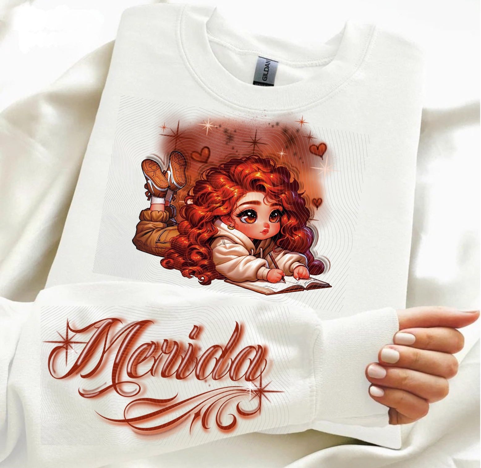 Merida-inspired princess sweatshirt featuring curly red hair, warm autumn colors, and a reading pose. Ideal for strong, independent girls who love books and adventurous princess stories.