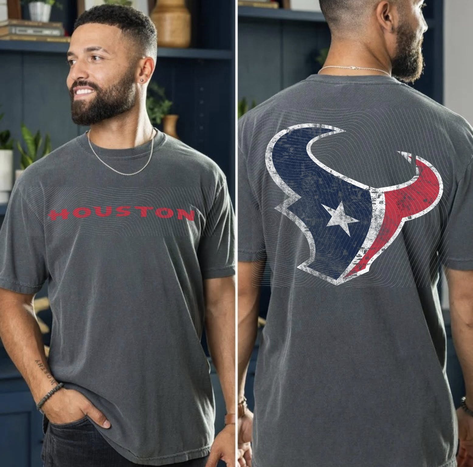 Oversized washed-gray t-shirt dress with “Houston” lettering on the front and a large distressed bull graphic on the back. Comfortable, relaxed fit perfect for casual days with a bold Houston statement.